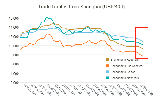 洛杉矶-上海、鹿特丹-上海、纽约-鹿特丹和鹿特丹-纽约的即期运费都出现1%-2%的降幅。